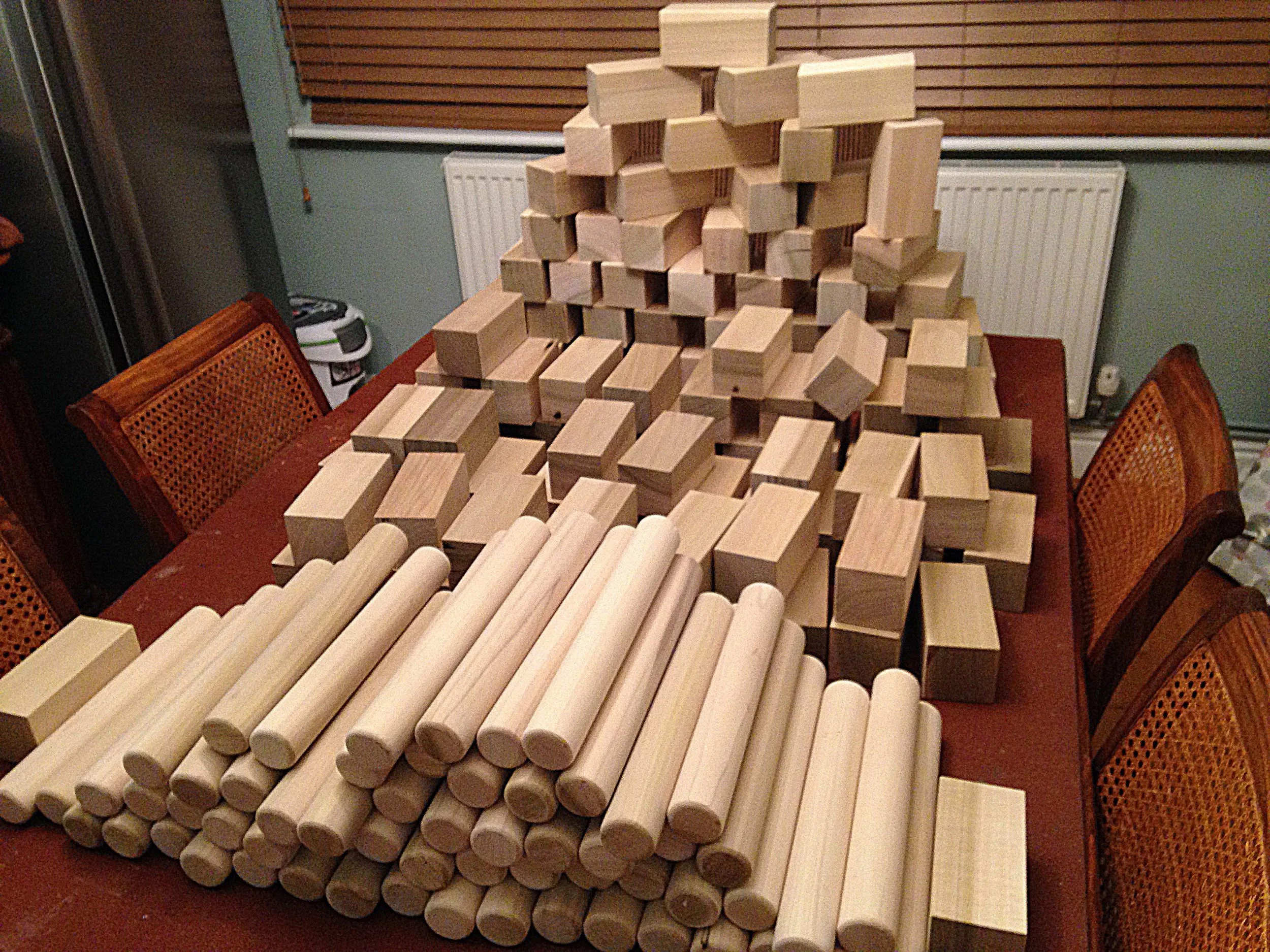 So....I now have sixty batons and one hundred kubbs, all in beautiful Poplar. Very happy overall. Next step will be oiling them with simple old Danish oil, and working out a way to brand them with our logo. I'll come back to that.