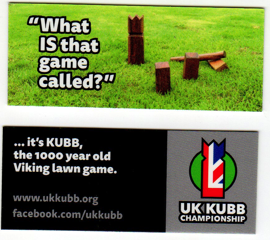 Once we got involved in the UK Kubb Championship, my friend Glenn had some little cards made up, so that when people asked about the game, we could send them away with a pointer to the web site. They work really well.